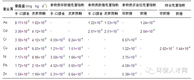 基于健康风险评价模型及相关参数指标,利用污泥中重金属检测结果对污泥的重金属健康风险进行评价,儿童健康风险评价结果与成人健康风险评价结果分别如表 9和表 10所示.对于目标暴露人群为儿童,以手-口摄食为暴露途径时,单一物质非致癌危害指数高的元素是Cu,危害指数为1.21×10-1;以皮肤接触为暴露途径时,单一物质非致癌危害指数高的元素同样是Cu,其危害指数为1.51×10-3,各重金属对非致癌风险贡献率从高到低的顺序是Cu > Cr >Zn> Pb > Ni.污泥重金属非致癌综合危害指数为2.02×10-1,致癌综合危害指数为1.44×10-4,其中,以手-口摄食为暴露途径时,其非致癌与致癌风险分别是2.00×10-1和1.42×10-4,以皮肤接触为暴露途径时,其非致癌与致癌风险分别是2.62×10-3和1.78×10-6,手-口摄食暴露途径为主要的暴露途径.本次污泥金属健康风险评价研究中,非致癌综合危害指数为1.09×10-1,并未达到非致癌风险警戒值“1”,对于儿童来说并不存在非致癌风险;污泥重金属致癌综合危害指数为1.44×10-4,超出USEPA提供的可接受区间(1×10-4 ~ 1×10-6),存在一定的致癌风险.但需要指出的是,为了揭示大的致癌风险值,该研究是假设长期生活在布满污泥的环境中,因此,实际生活中,可能并不存在致癌风险.